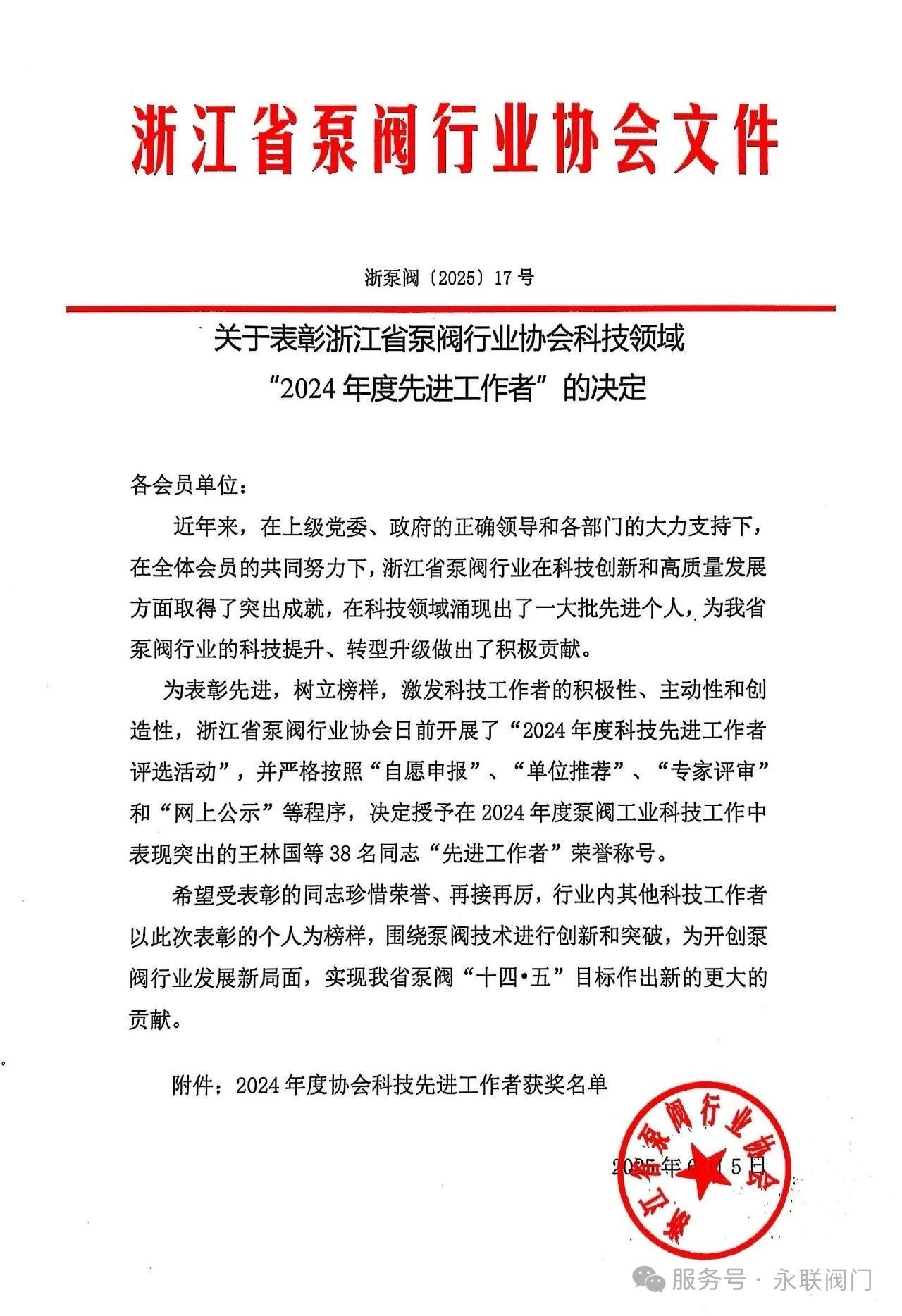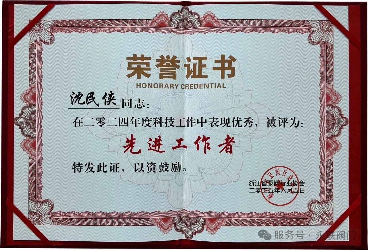 为表彰先进,树立榜样,激发科技工作者的积极性、主动性和创造性,浙江省泵阀行业协会日前开展了“2024年度科技先进工作者评选活动”,浙江永联阀门集团总经理沈民侠荣获浙江省泵阀协会优秀“先进工作者”荣誉称号。