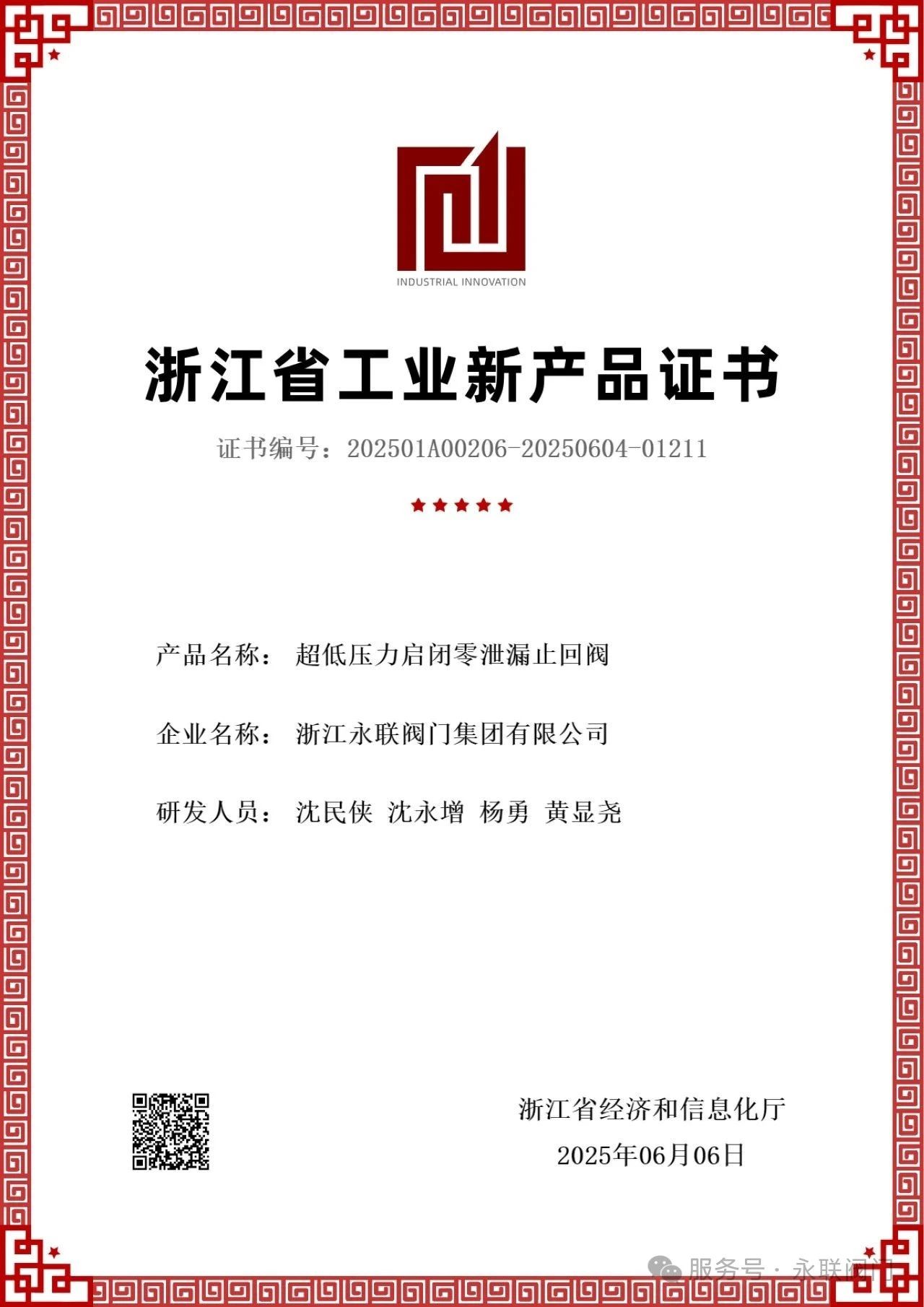 在沈民侠的带领下取得两项浙江省省级工业新产品“超低压力启闭零泄露止回阀”和“耐负压衬氟蝶阀”。